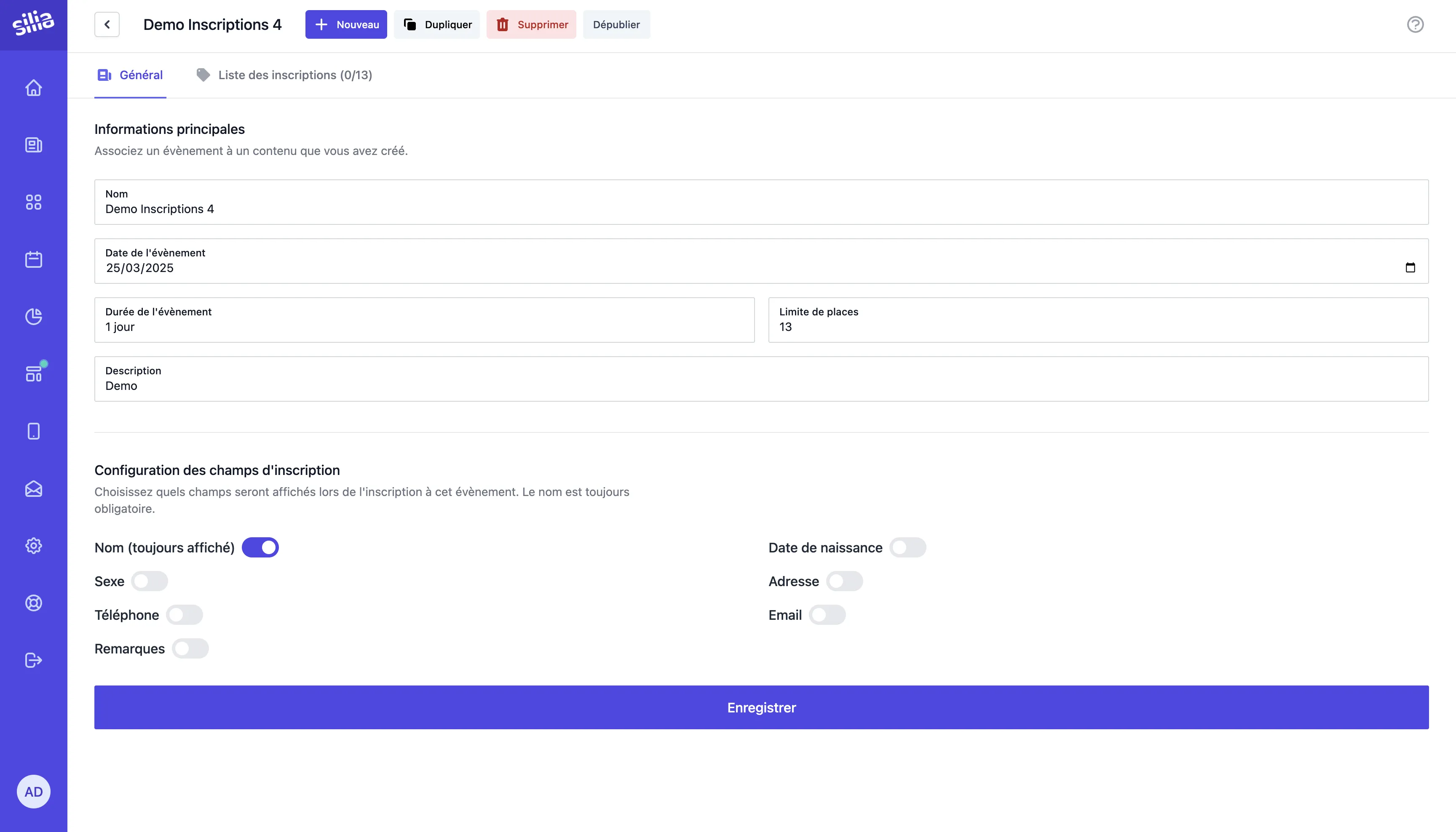 Créez et gérez vos événements en toute simplicité. Renseignez les dates, le nombre de places, une description, et personnalisez le formulaire d'inscription selon vos besoins.